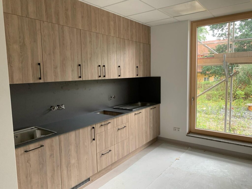The kitchen is designed to be functional, with sufficient work space and storage space. The dark worktop and backsplash are practical to maintain and visually separate the work area from the rest of the interior. Preparations for appliances and electrical installations are concealed so that nothing detracts from the overall appearance.