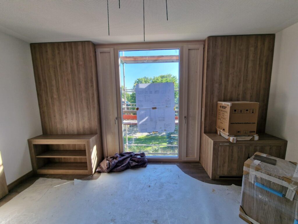 Open niches and lower cabinets create space for technology, accessories, or future furnishings without the need for further modifications to the walls. Everything is prepared so that the space can be easily adapted to its actual use.
